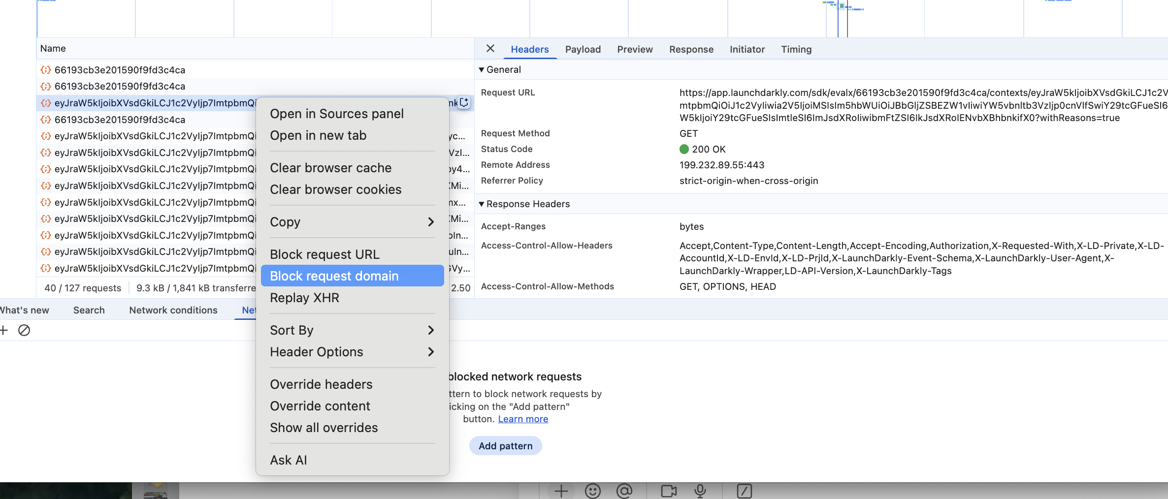 clientstream.launchdarkly.com,clientsdk.launchdarkly.com, and/orapp.launchdarkly.comin DevTools.